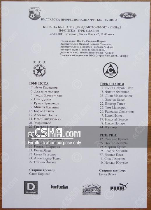 CSKA won against Slavia 1913 (Sofia) with result 1:0 in match from Final of Cup of Bulgaria 2010/11 played on 25 May 2011 at 19:00 on „Vasil Levski“ stadium, in Sofia. goalscorer for the army men was Spas Delev (39′).