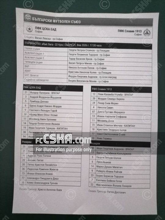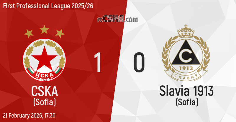 CSKA won against Slavia 1913 (Sofia) with result 1:0 in match from 22nd round of First Professional League 2025/26 played on 21 February 2026 at 17:30 on „Vasil Levski“ stadium, in Sofia. goalscorer for the army men was Alejandro Piedrahita (82′).