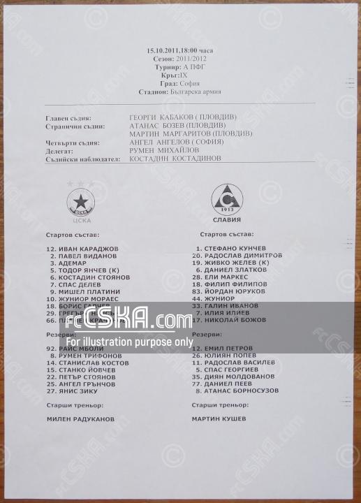 CSKA lost against Slavia 1913 (Sofia) with result 1:2 in match from 9th round of „А“ Football Group 2011/12 played on 15 October 2011 at 18:00 on „Bulgarska armia“ stadium, in Sofia. goalscorer for the army men was Ianis Zicu (89′).