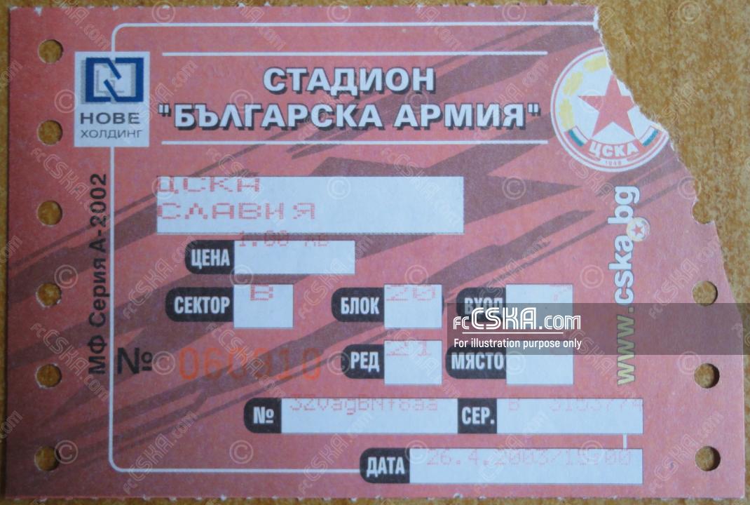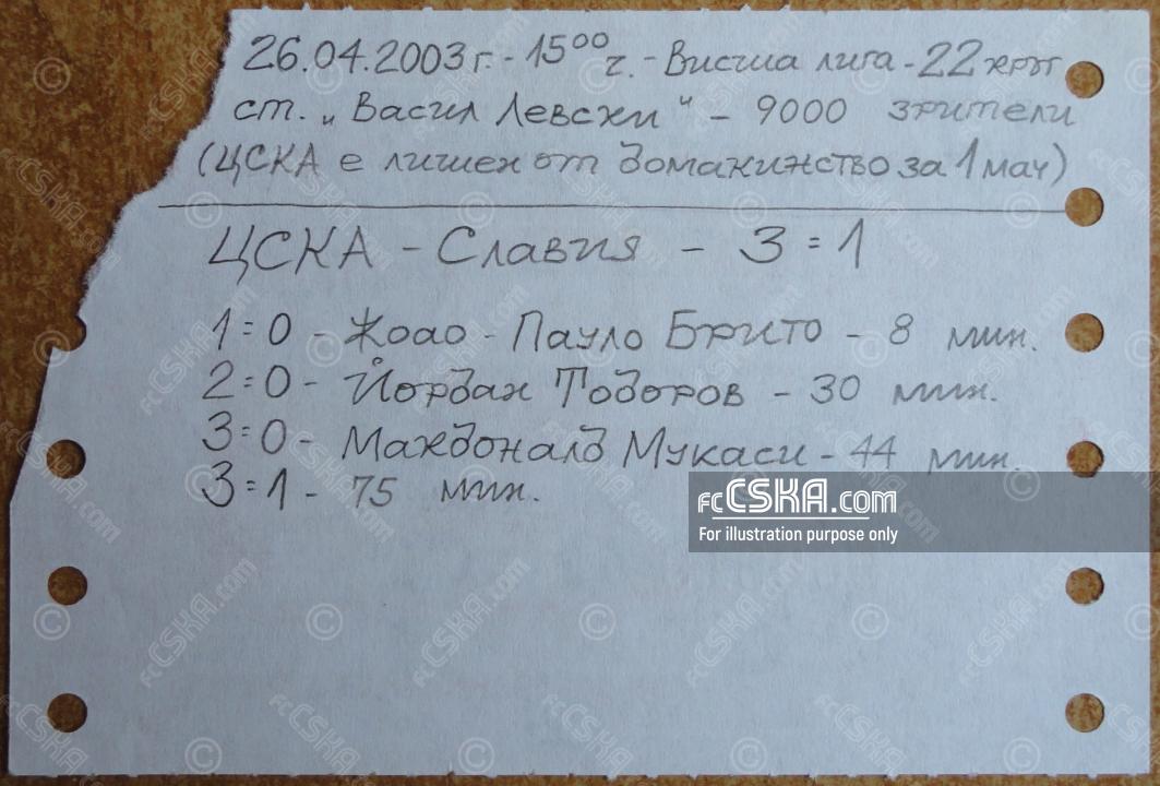 CSKA won against Slavia 1913 (Sofia) with result 3:1 in match from 22nd round of Premier Professional Football League 2002/03 played on 26 April 2003 at 15:00 on „Vasil Levski“ stadium, in Sofia. goalscorers for the army men were João Paulo Brito (8′), Yordan Todorov (30′) and MacDonald Mukansi (44′).
