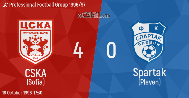 CSKA won against Spartak (Pleven) with result 4:0 in match from 9th round of „А“ Professional Football Group 1996/97 played on 18 October 1996 at 17:30 on „Bulgarska armia“ stadium, in Sofia. goalscorers for the army men were Petar Zhabov (11′), Ilia Voynov (32′ from penalty), Ivo Slavchev (35′) and Kancho Yordanov (43′).