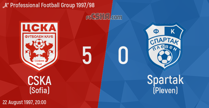 CSKA won against Spartak (Pleven) with result 5:0 in match from 3rd round of „А“ Professional Football Group 1997/98 played on 22 August 1997 at 20:00 on „Bulgarska armia“ stadium, in Sofia. goalscorers for the army men were Filip Filipov (22′), Milen Petkov (24′), Boncho Genchev (71′ and 82′) and Ivaylo Andonov (85′).