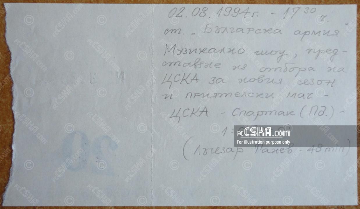 CSKA won against Spartak (Plovdiv) with result 1:0 in match from Friendly games 1994/95 played on 2 August 1994 at 18:00 on „Bulgarska armia“ stadium, in Sofia. goalscorer for the army men was Lachezar Tanev (48′).