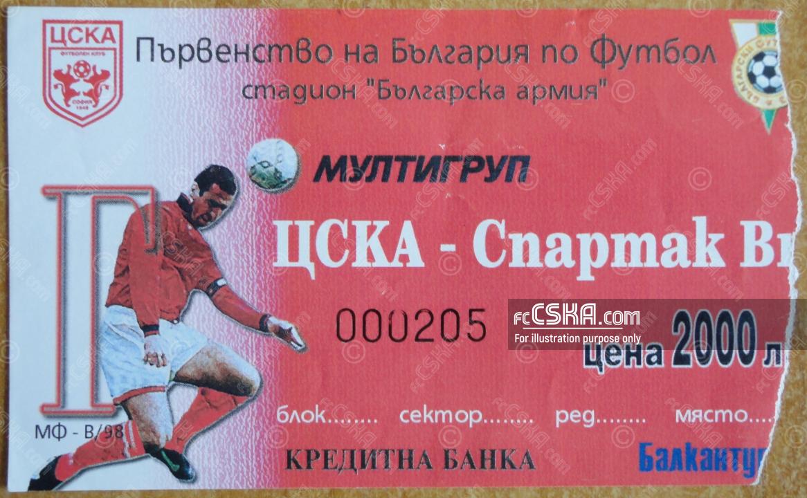 CSKA won against Spartak (Varna) with result 2:1 in match from 13th round of „А“ Professional Football Group 1998/99 played on 21 November 1998 at 14:30 on „Bulgarska armia“ stadium, in Sofia. goalscorers for the army men were Valentin Stanchev (21′) and Milen Petkov (78′ from penalty).