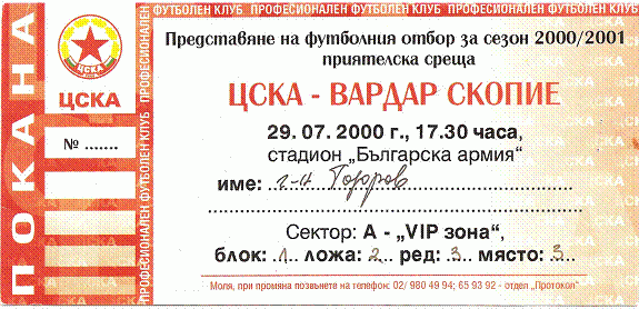 CSKA won against Vardar (Skopje) with result 2:0 in match from Friendly games 2000/01 played on 29 July 2000 on „Bulgarska armia“ stadium, in Sofia. goalscorers for the army men were Konstantin Mirchev (16′ from penalty) and Dimitar Berbatov (65′).