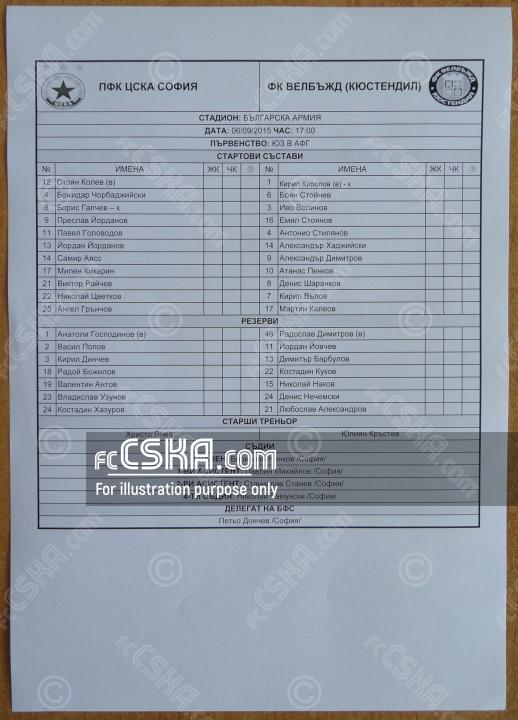 CSKA won against Velbazhd (Kyustendil) with result 6:0 in match from 5th round of South-West „V“ Group 2015/16 played on 6 September 2015 at 17:00 on „Bulgarska armia“ stadium, in Sofia. goalscorers for the army men were Pavel Golovodov (7′), Preslav Yordanov (17′, 37′ and 52′), Boris Galchev (59′) and Vladislav Uzunov (87′).