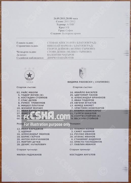 CSKA won against Vidima-Rakovski (Sevlievo) with result 4:1 in match from 7th round of „А“ Football Group 2011/12 played on 26 September 2011 at 20:00 on „Bulgarska armia“ stadium, in Sofia. goalscorers for the army men were Plamen Krachunov (23′), Spas Delev (35′) and Ianis Zicu (72′ and 87′ from penalty).
