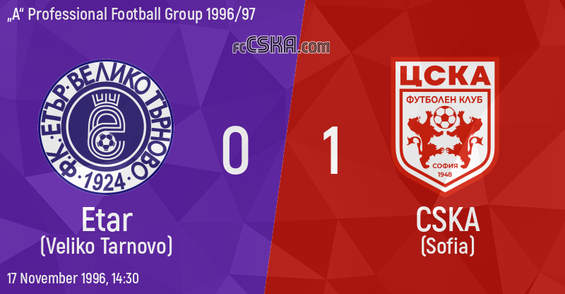 CSKA won against Etar (Veliko Tarnovo) with result 0:1 in match from 12th round of „А“ Professional Football Group 1996/97 played on 17 November 1996 at 14:30 on „Ivaylo“ stadium, in Veliko Tarnovo. goalscorer for the army men was Ivaylo Andonov (9′).