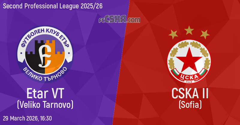 CSKA II will play with Etar VT in match from 26th round of Second Professional League 2025/26 on 29 March 2026 at 16:30 on „Ivaylo“ stadium, in Veliko Tarnovo.
