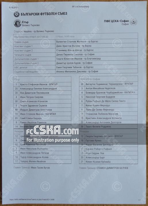 CSKA draw against Etar VT (Veliko Tarnovo) with result 2:2 in match from 11th round of First Professional League 2017/18 played on 30 September 2017 at 14:45 on „Ivaylo“ stadium, in Veliko Tarnovo. goalscorer for the army men was Fernando Karanga (30′ and 62′).
