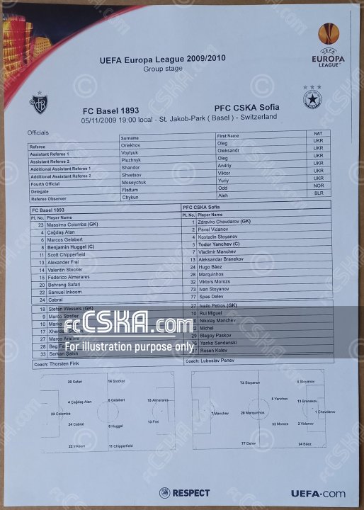 CSKA lost against FC Basel 1893 with result 3:1 in match from Group „E“ — fourth round of Europa League 2009/10 - Group „Е“ played on 5 November 2009 at 19:00 on „St. Jakob-Park“ stadium, in Basel. goalscorer for the army men was Todor Yanchev (61′).