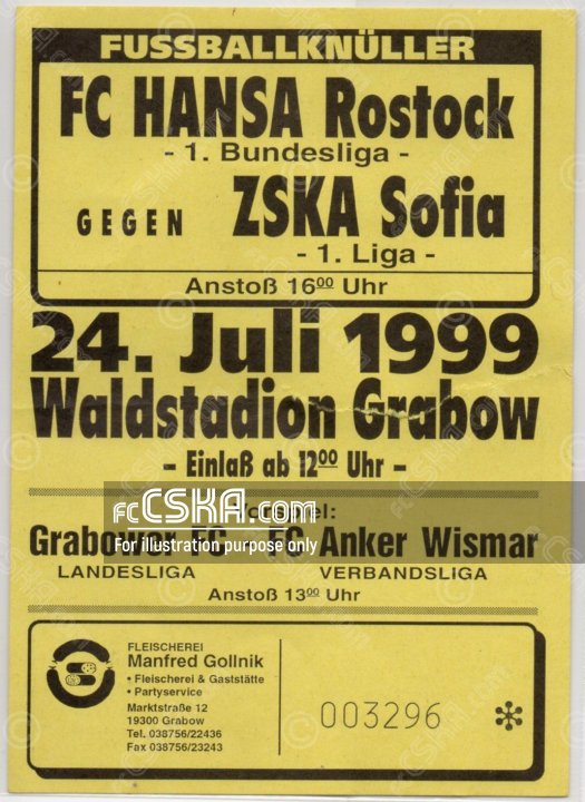 CSKA lost against FC Hansa (Rostock) with result 2:0 in match from Friendly games 1999/00 played on 24 July 1999 on „Shportplats Grabow“ stadium, in Grabow.