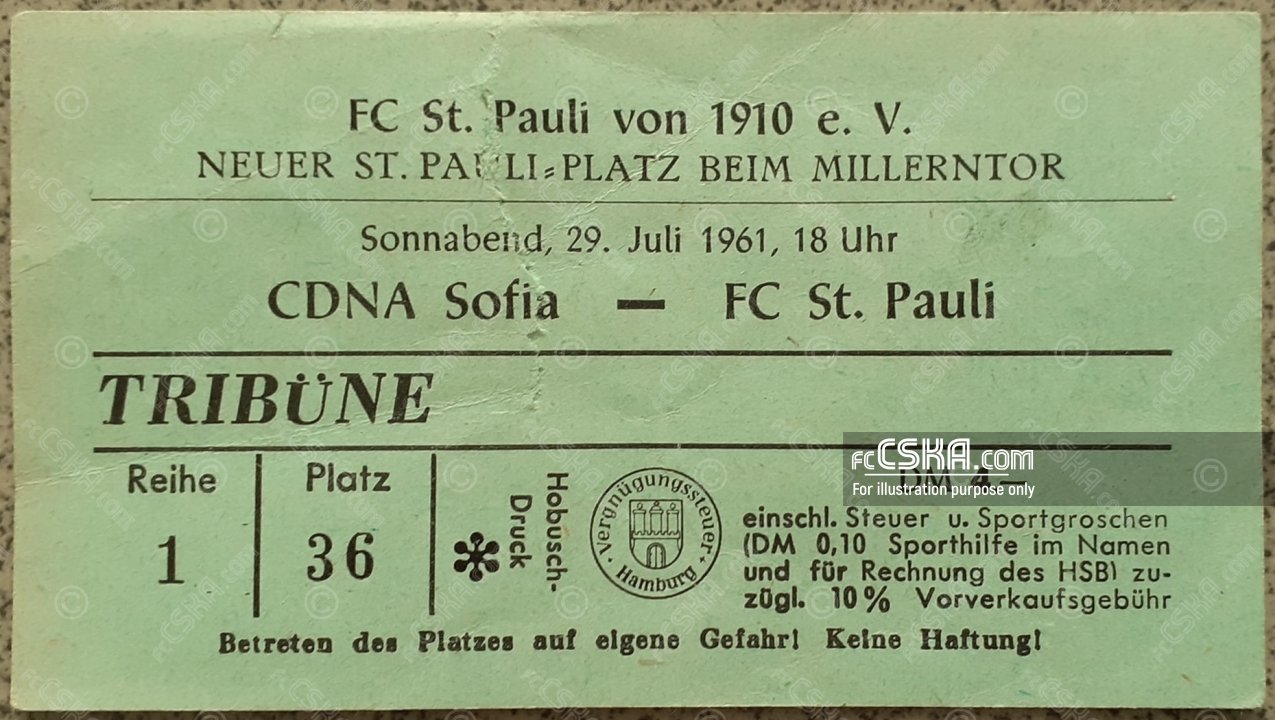 CDNA won against FC St. Pauli (Hamburg) with result 4:7 in match from Friendly games 1961/62 played on 29 July 1961 at 19:00 on „Millerntor“ stadium, in Hamburg. goalscorers for the army men were Ivan Kolev, Nikola Tsanev, Ivan Rankov and Dimitar Yakimov.