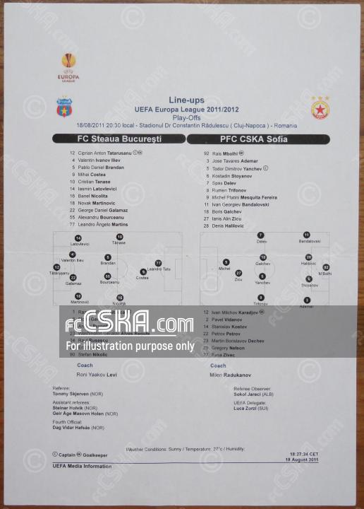 CSKA lost against FC Steaua (București) with result 2:0 in match from Play-off — First Leg of Europa League 2011/12 played on 18 August 2011 at 20:30