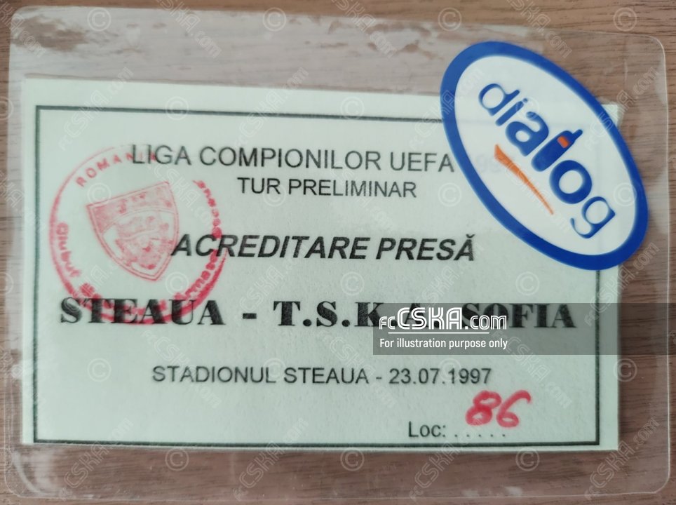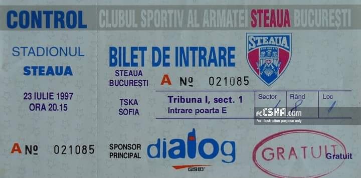 CSKA draw against FC Steaua (București) with result 3:3 in match from I preliminary round — First Leg of Champions League 1997/98 played on 23 July 1997 at 20:15 on „Ghencea“ stadium, in Bucharest. goalscorers for the army men were Ivaylo Andonov (47′) and Anatoli Nankov (49′ and 68′).
