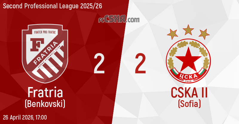 CSKA II draw against Fratria (Benkovski) with result 2:2 in match from 30th round of Second Professional League 2025/26 played on 26 April 2026 at 17:00