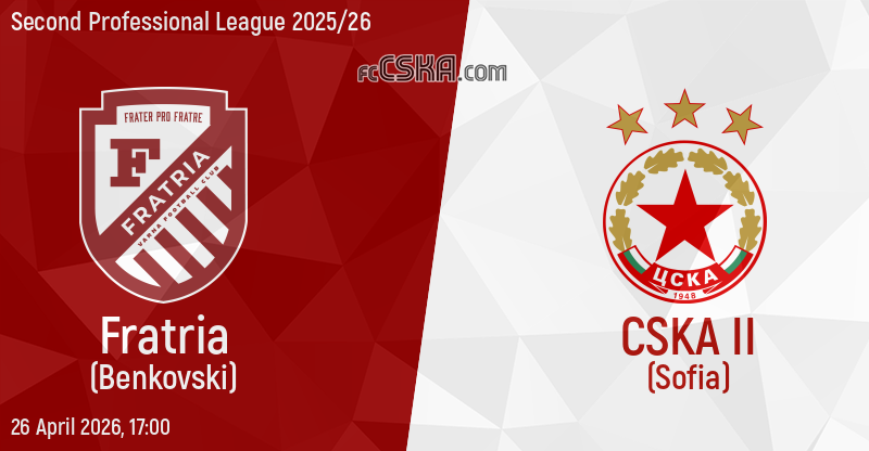 CSKA II will play with Fratria in match from 30th round of Second Professional League 2025/26 on 26 April 2026 at 17:00