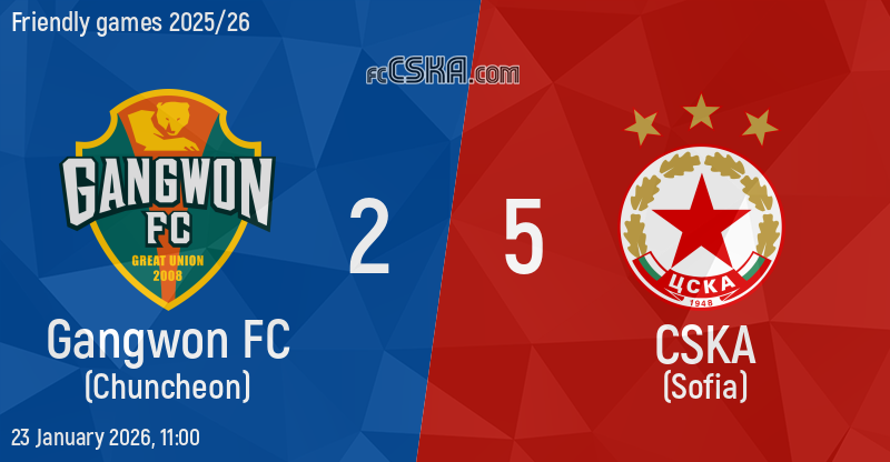 CSKA won against Gangwon FC (Chuncheon) with result 2:5 in match from Friendly games 2025/26 played on 23 January 2026 at 11:00 on „Side Star Sports Complex“ stadium, in Side. goalscorers for the army men were Kevin Dodaj (12′), Mohammed Brahimi (55′ and 71′), Leandro Godoy (57′) and Bruno Jordão (70′).