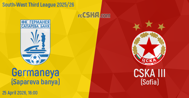 CSKA III will play with Germaneya in match from 29th round of South-West Third League 2025/26 on 25 April 2026 at 16:00 on „Sapareva banya“ stadium, in Sapareva banya.