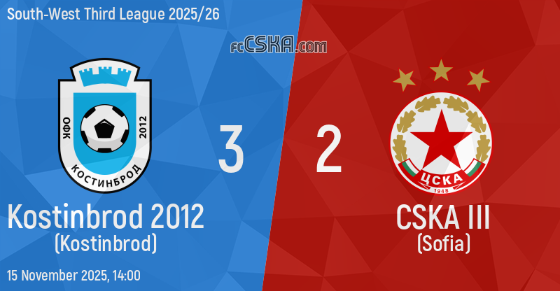 CSKA III lost against Kostinbrod 2012 (Kostinbrod) with result 3:2 in match from 17th round of South-West Third League 2025/26 played on 15 November 2025 at 14:00 on „Georgi Benkovski“ stadium, in Kostinbrod.