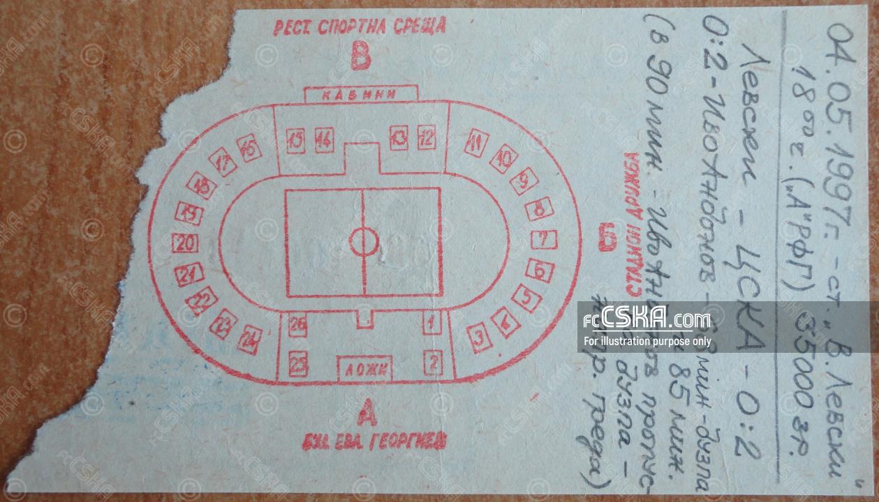 CSKA won against Levski 1914 (Sofia) with result 0:2 in match from 26th round of „А“ Professional Football Group 1996/97 played on 4 May 1997 at 18:00 on „Vasil Levski“ stadium, in Sofia. goalscorer for the army men was Ivaylo Andonov (68′ from penalty and 85′).