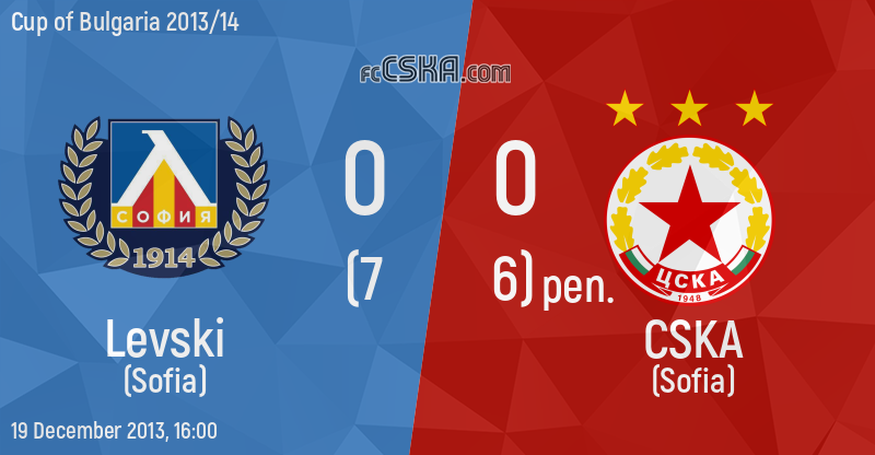 CSKA draw against Levski (Sofia) with result 0:0 in match from Round of 16 — Second Leg of Cup of Bulgaria 2013/14 played on 19 December 2013 at 16:00 on „Vasil Levski“ stadium, in Sofia. goalscorers for the army men were Anton Karachanakov (130′ from penalty), Todor Yanchev (130′ from penalty), Apostol Popov (130′ from penalty), Ivaylo Chochev (130′ from penalty), Ventsislav Vasilev (130′ from penalty) and Jackson Mendy (130′ from penalty).