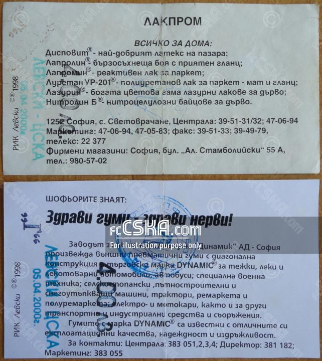 CSKA lost against Levski (Sofia) with result 3:1 in match from Quarterfinal — Second Leg of Cup of Bulgaria 1999/00 played on 5 April 2000 at 17:00 on „Georgi Asparuhov“ stadium, in Sofia. goalscorer for the army men was Dimitar Ivanov (86′ from penalty).