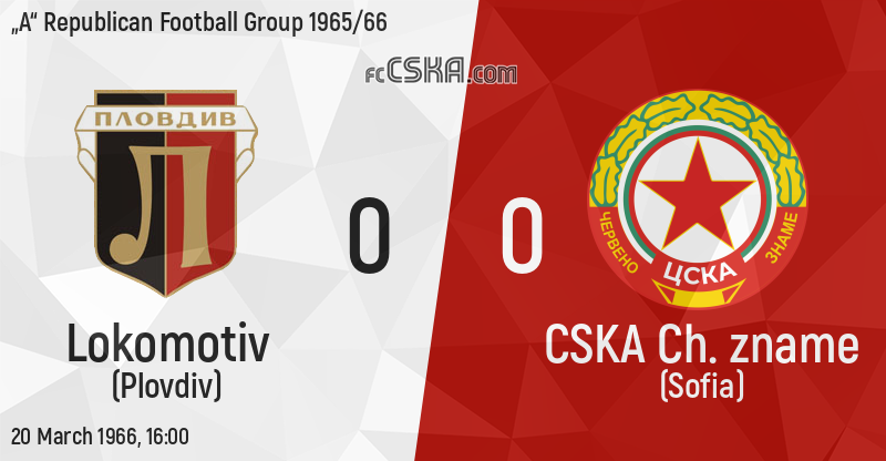 CSKA „Cherveno zname“ draw against Lokomotiv (Plovdiv) with result 0:0 in match from 16th round of „А“ Republican Football Group 1965/66 played on 20 March 1966 at 16:00 on „9-ti septemvri“ stadium, in Plovdiv.