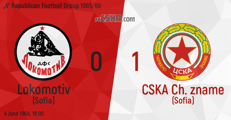 CSKA „Cherveno zname“ won against Lokomotiv (Sofia) with result 0:1 in match from 27th round of „А“ Republican Football Group 1965/66 played on 4 June 1966 at 18:00 on „Vasil Levski“ stadium, in Sofia. goalscorer for the army men was Nikola Tsanev (52′).