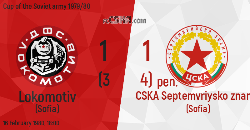 CSKA „Septemvriysko zname“ draw against Lokomotiv (Sofia) with result 1:1 in match from Round of 16 of Cup of the Soviet army 1979/80 played on 16 February 1980 at 18:00 on „Vasil Levski“ stadium, in Sofia. goalscorers for the army men were Ivan Metodiev (23′ and 121′ from penalty), Nikola Hristov (121′ from penalty), Mario Valkov (121′ from penalty) and Plamen Markov (121′ from penalty).