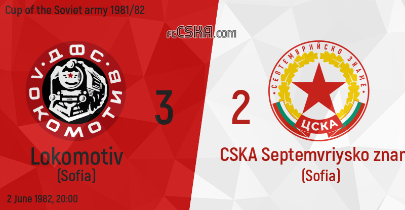 CSKA „Septemvriysko zname“ lost against Lokomotiv (Sofia) with result 3:2 in match from Semifinals of Cup of the Soviet army 1981/82 played on 2 June 1982 at 20:00 on „Vasil Levski“ stadium, in Sofia. goalscorers for the army men were Metodi Tomanov (45′ from penalty) and Stoycho Mladenov (80′).