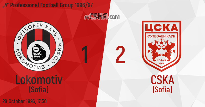 CSKA won against Lokomotiv (Sofia) with result 1:2 in match from 10th round of „А“ Professional Football Group 1996/97 played on 28 October 1996 at 17:30 on „Vasil Levski“ stadium, in Sofia. goalscorers for the army men were Petar Zhabov (34′) and Milen Petkov (70′ from penalty).