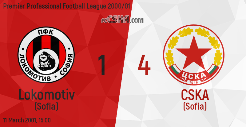 CSKA won against Lokomotiv (Sofia) with result 1:4 in match from 15th round of Premier Professional Football League 2000/01 played on 11 March 2001 at 15:00 on „Lokomotiv“ stadium, in Sofia. goalscorers for the army men were Vladimir Manchev (5′), Metodi Deyanov (32′), Asen Bukarev (34′) and Mićo Vranješ (82′).