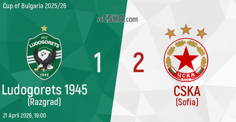CSKA won against Ludogorets 1945 (Razgrad) with result 1:2 in match from Semifinals of Cup of Bulgaria 2025/26 played on 21 April 2026 at 19:00 on „Ludogorets Arena“ stadium, in Razgrad. goalscorers for the army men were Ioannis Pittas (82′) and Leandro Godoy (85′).