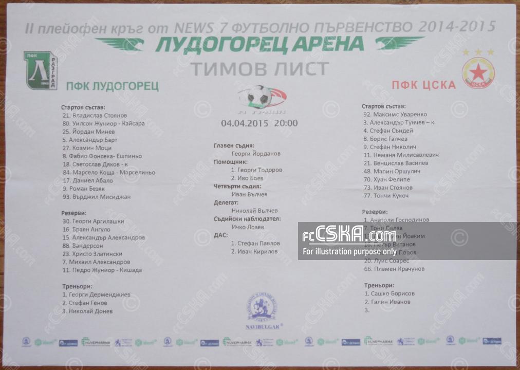 CSKA lost against Ludogorets 1945 (Razgrad) with result 4:0 in match from 24th round of „А“ Football Group 2014/15 - first six played on 4 April 2015 at 20:00 on „Ludogorets Arena“ stadium, in Razgrad.