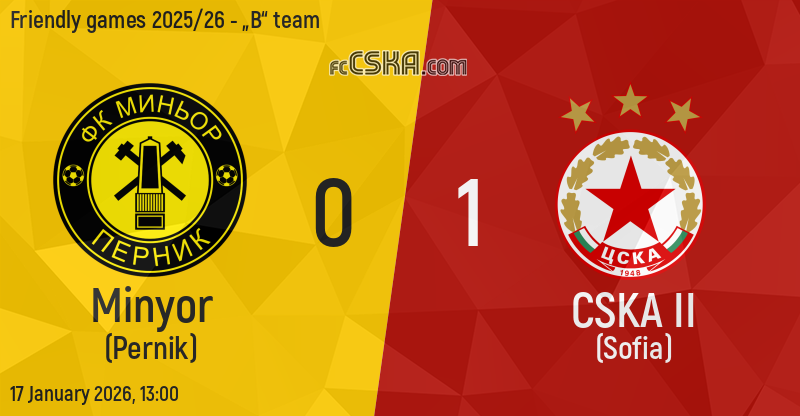 CSKA II won against Minyor (Pernik) with result 0:1 in match from Friendly games 2025/26 - „B“ team played on 17 January 2026 at 13:00 on „Sports centre „Yulii Tushev"“ stadium, in Valkovo.