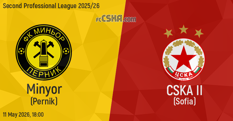 CSKA II will play with Minyor in match from 32nd round of Second Professional League 2025/26 on 11 May 2026 at 18:00 on „Minjor“ stadium, in Pernik.
