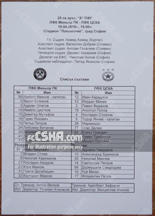 CSKA draw against Minyor (Pernik) with result 0:0 in match from 25th round of „А“ Football Group 2009/10 played on 18 April 2010 at 15:00 on „Lokomotiv“ stadium, in Sofia.