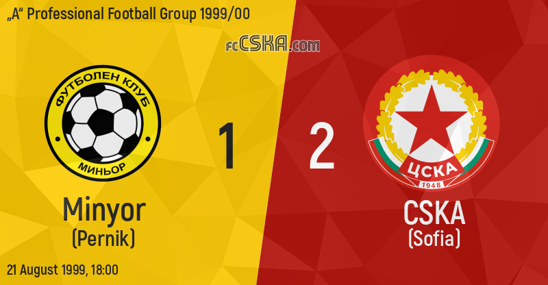 CSKA won against Minyor (Pernik) with result 1:2 in match from 3rd round of „А“ Professional Football Group 1999/00 played on 21 August 1999 at 18:00 on „Minjor“ stadium, in Pernik. goalscorer for the army men was Rumen Hristov (76′ and 82′).