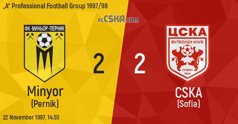 CSKA draw against Minyor (Pernik) with result 2:2 in match from 15th round of „А“ Professional Football Group 1997/98 played on 22 November 1997 at 14:30 on „Minjor“ stadium, in Pernik. goalscorers for the army men were Boncho Genchev (47′) and Ivo Slavchev (49′).