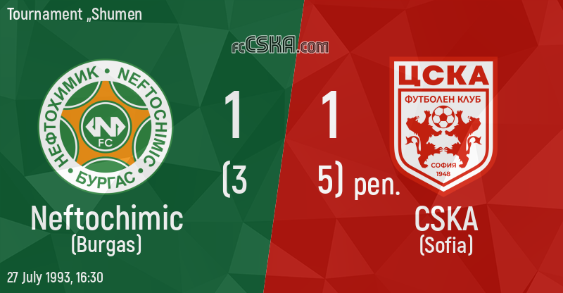 CSKA draw against Neftochimic (Burgas) with result 1:1 in match from Semifinals of Tournament „Shumen played on 27 July 1993 at 16:30 goalscorer for the army men was Anatoli Nankov (85′).
