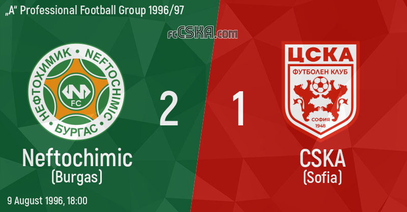 CSKA lost against Neftochimic (Burgas) with result 2:1 in match from 1st round of „А“ Professional Football Group 1996/97 played on 9 August 1996 at 18:00 goalscorer for the army men was Ivaylo Andonov (41′).