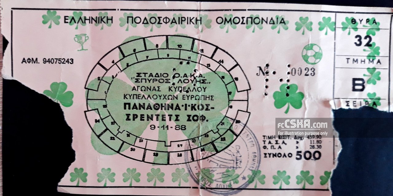 CFKA „Sredets“ won against Panathinaikos (Athens) with result 0:1 in match from Round of 16 — Second Leg of Cup Winners' Cup 1988/89 played on 9 November 1988 on „Olympic Stadium“ stadium, in Athens. goalscorer for the army men was Lyuboslav Penev (85′ from penalty).