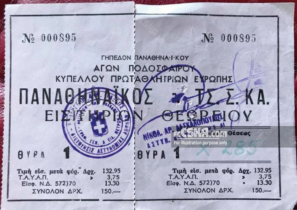 CSKA „Septemvriysko zname“ draw against Panathinaikos (Athens) with result 4:4 in match from Round of 32 — Second Leg of European Champion Clubs' Cup 1972/73 played on 27 September 1972 at 17:00 on „Apostolos Nikolaidis“ stadium, in Atina. goalscorers for the army men were Stoil Trankov (67′), Bozhil Kolev (121′ from penalty), Asparuh Nikodimov (121′ from penalty) and Dimitar Marashliev (121′ from penalty).