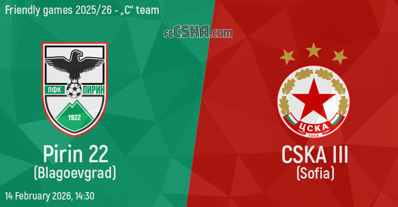 CSKA III will play with Pirin in match from Friendly games 2025/26 - „C“ team on 14 February 2026 at 14:30