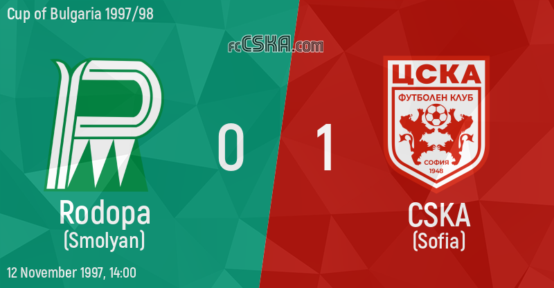 CSKA won against Rodopa (Smolyan) with result 0:1 in match from Round of 32 of Cup of Bulgaria 1997/98 played on 12 November 1997 at 14:00 goalscorer for the army men was Ivaylo Andonov (65′).