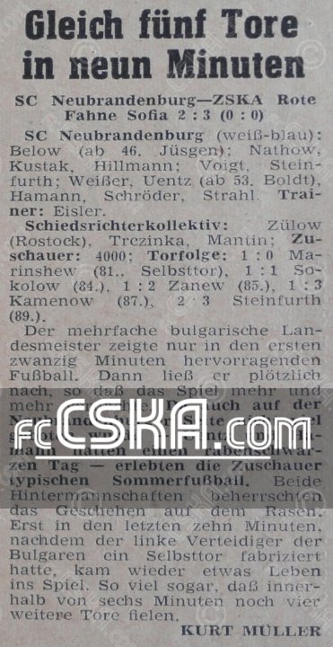 CSKA „Cherveno zname“ won against SC Neubrandenburg with result 2:3 in match from Friendly games 1964/65 played on 15 May 1965 goalscorers for the army men were Sokolov[1] (84′), Nikola Tsanev (85′) and Evden Kamenov (87′).