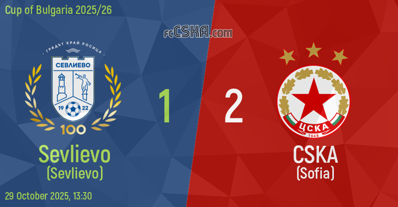 CSKA​ won against Sevlievo (Sevlievo) with result 1:2 in match from Round of 32 — second round of Cup of Bulgaria 2025/26 played on 29 October 2025 at 13:30 goalscorers for the army men were Sainey Sanyang (38′) and Mohammed Brahimi (60′).