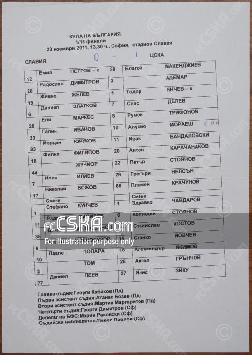 CSKA won against Slavia 1913 (Sofia) with result 0:1 in match from Second round of Cup of Bulgaria 2011/12 played on 23 November 2011 at 13:30 on „Slavia“ stadium, in Sofia. goalscorer for the army men was Júnior Moraes (19′).