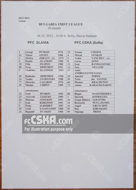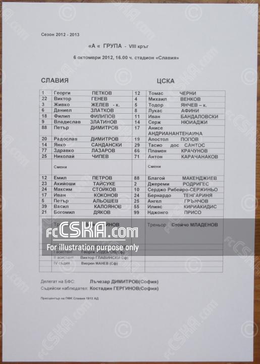 CSKA won against Slavia 1913 (Sofia) with result 0:2 in match from 8th round of „А“ Football Group 2012/13 played on 6 October 2012 at 16:00 on „Slavia“ stadium, in Sofia. goalscorer for the army men was Mihail Venkov (90′). Auto goal for the home teams scored Georgi Petkov[1] (1′).
